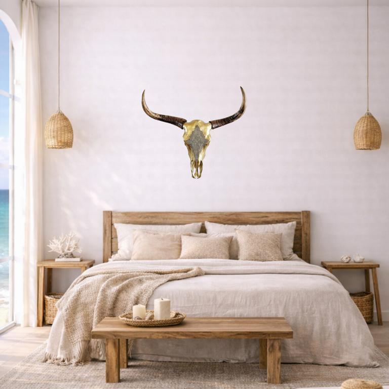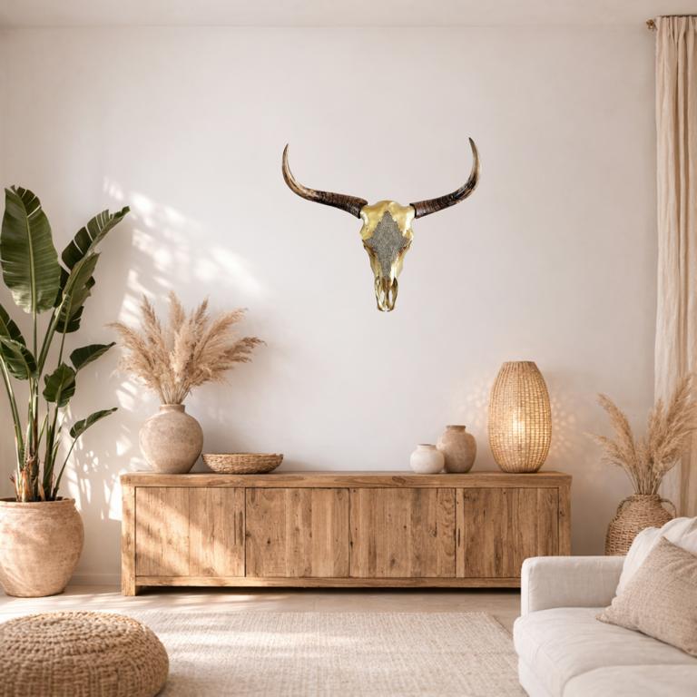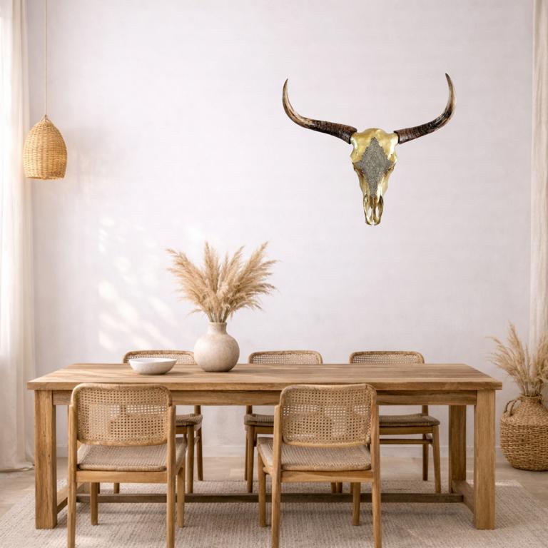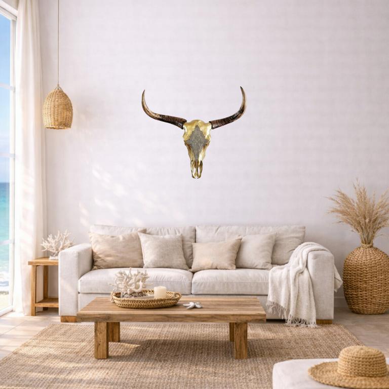 Der majestätische Stierkopf steht für Stärke und Durchsetzungsvermögen. In Kombination mit der goldenen Farbe wird er zu einem kraftvollen Symbol, das nicht nur deinen Raum schmückt, sondern auch positive Energie und Entschlossenheit ausstrahlt. Ob im Wohnzimmer, im Büro, oder auch im Schlafzimmer, an dieser exklusiven Wanddeko wirst du dich jeden Tag aufs Neue erfreuen können. Natürlich macht sich der schwere Stierkopf / Bullenkopf auch sehr gut in einer tollen Bar oder einem eleganten Restaurant. Beeindrucke mal wieder deine Gäste und Freunde mit einer ganz besonderen XXL Wanddeko.