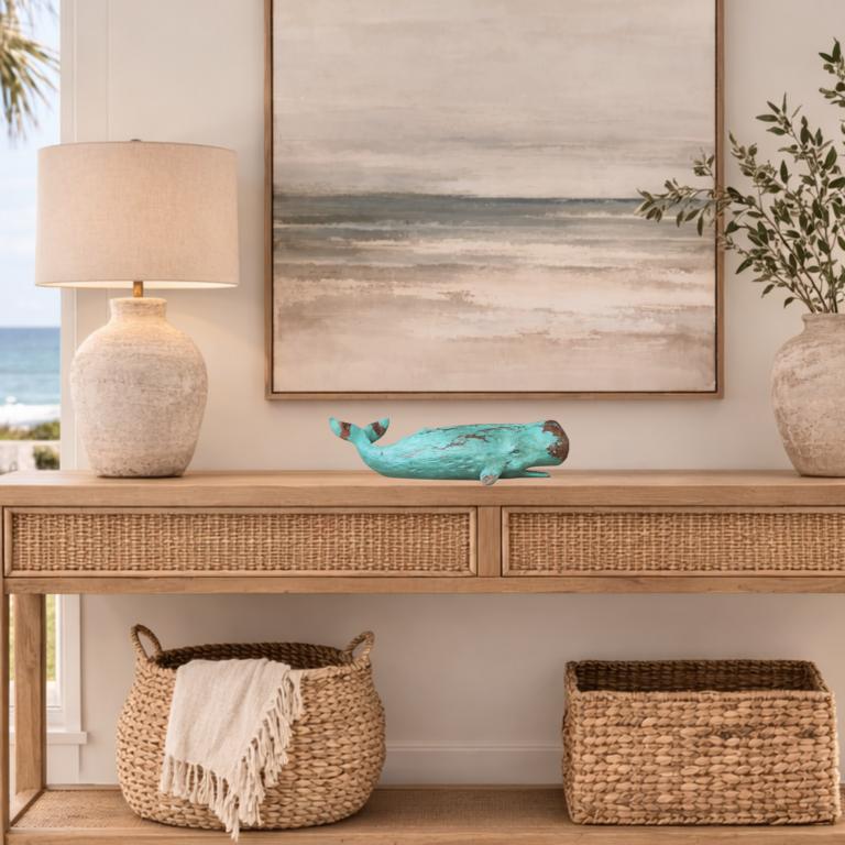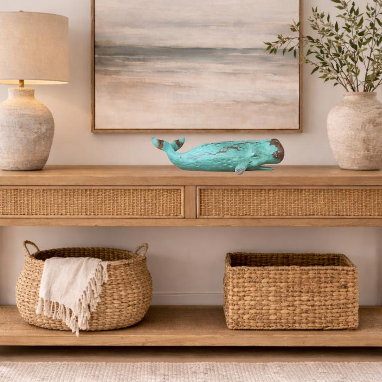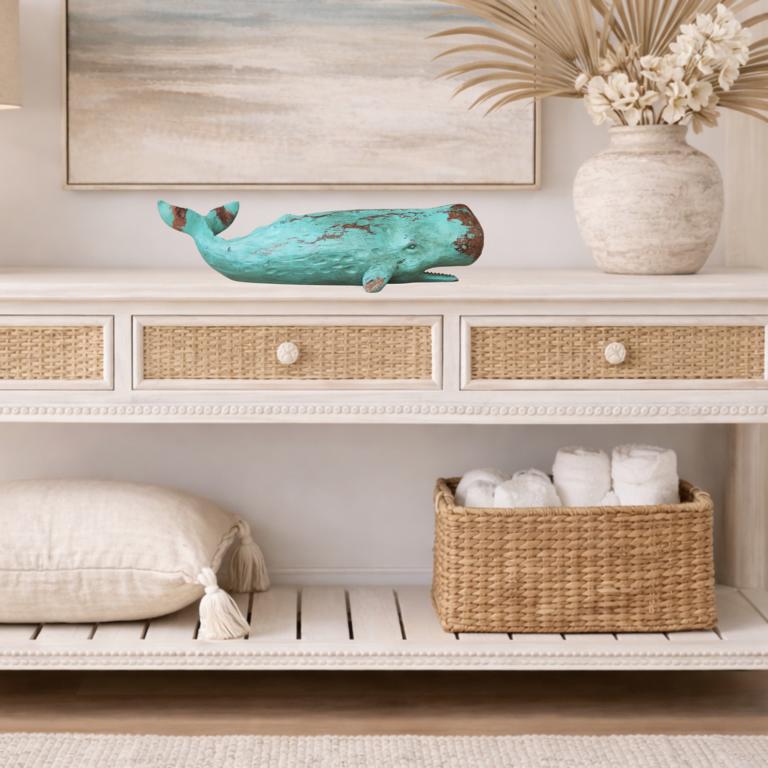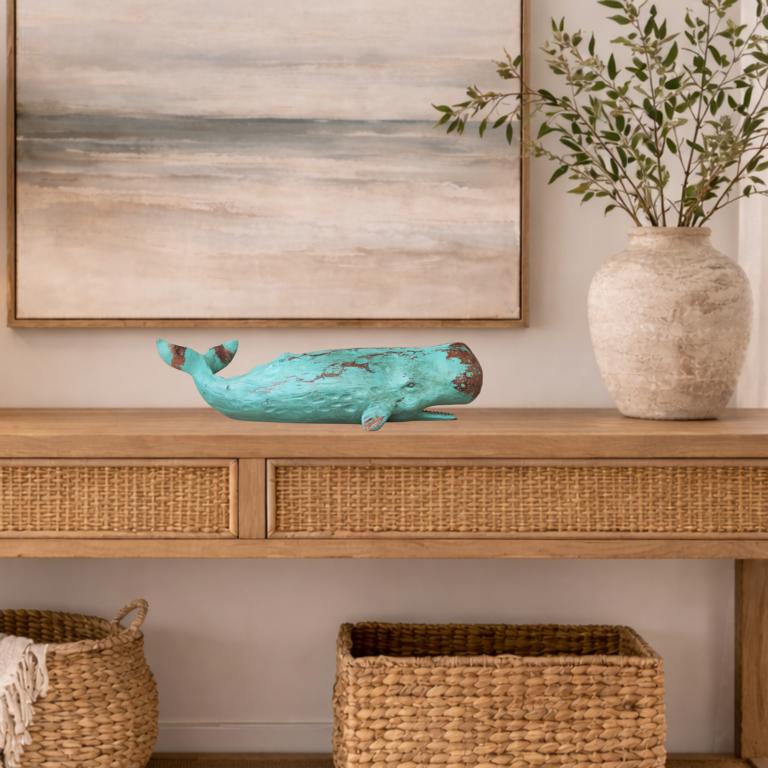 Der Deko-Wal macht sich sehr gut auf einer Kommode, Anrichte, auf einem Schreibtisch, oder auf der Fensterbank. Unsere Wal-Figur ist nicht nur ein Dekorationsobjekt, sondern ein Symbol für Freiheit und Abenteuerlust. Platziere sie im Wohnzimmer als faszinierendes Highlight oder integriere sie geschickt in dein maritimes Badezimmer für eine Extra-Portion Seeluft. Der Wal bringt nicht nur den Ozean in dein Zuhause, sondern auch eine spielerische Note, die deine Gäste begeistern wird.