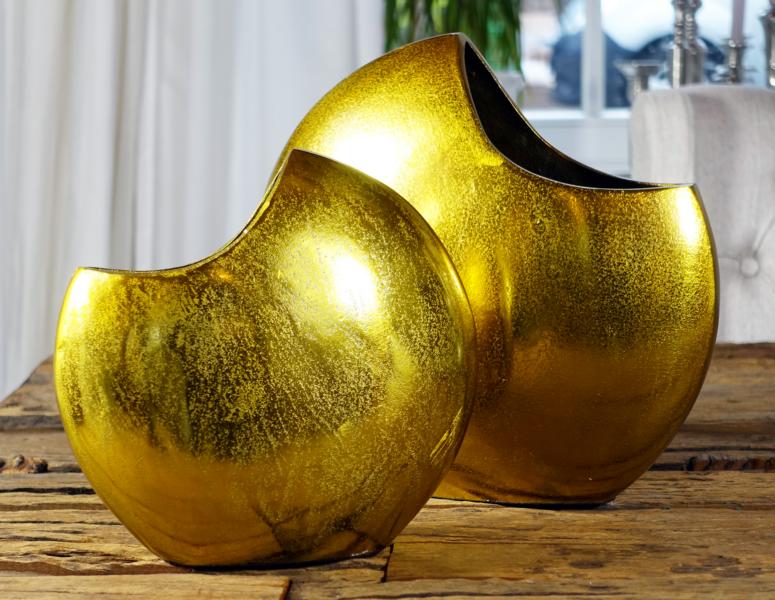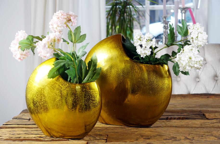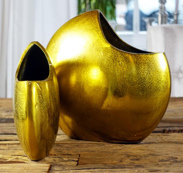 Diese bauchige Vase mit einer Größe von 28 cm hat ein exklusives und formschönes Design, das sofort positiv ins Auge fällt. Die wunderschöne goldene Tischvase wurde mit der Hand gefertigt und aus hochwertigem Aluminium hergestellt. Diese Blumenvase verleiht nahezu jedem Einrichtungs- und Wohlstil ein einzigartiges Flair. Durch das einzigartige Design gibt die Vase dem Raum eine besonders individuelle und stilvolle Note.